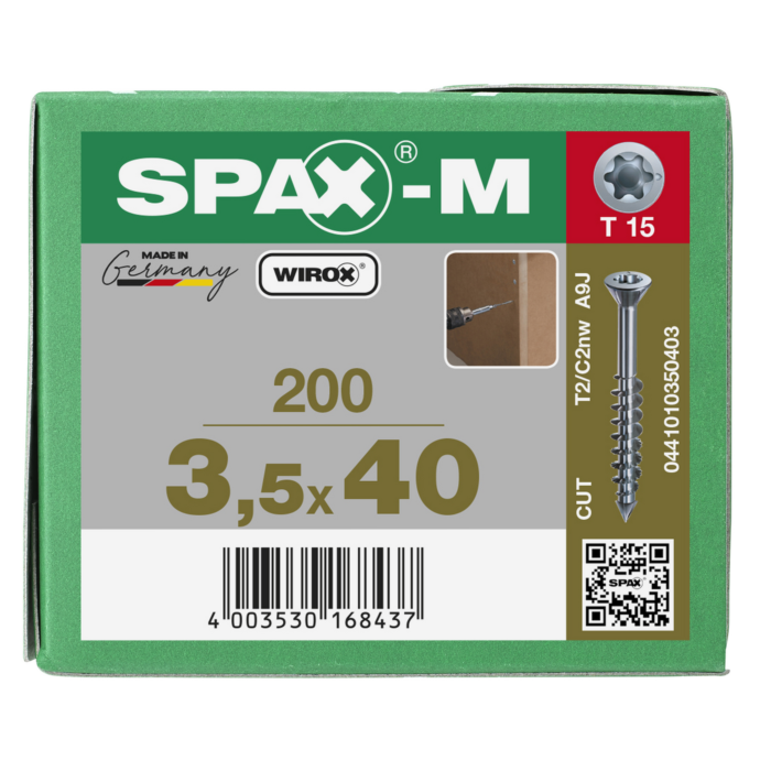 | Voordeel | zonder voorboren (afhankelijk van de houtsoort)door de speciale SPAX CUT-punt |