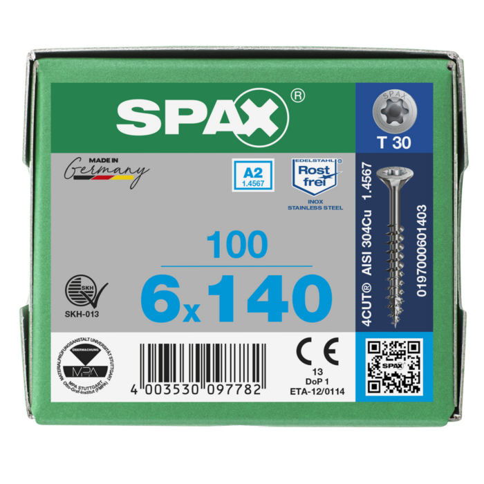 Spax spaanplaatschroeven T30 RVS A2 6 x 140 mm deeldraad 100 stuks
