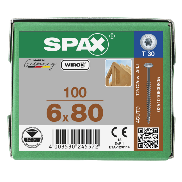 Spax tellerkopschroeven T30 verzinkt 6 x 80 mm voldraad 100 stuks